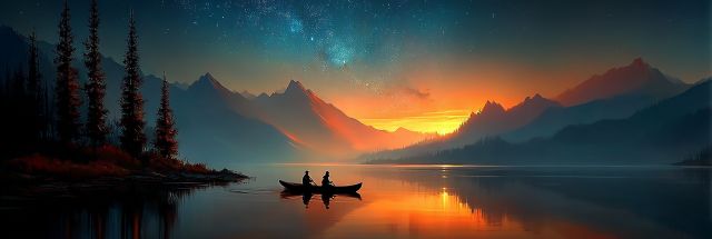 In an ethereal blend of celestial and earthly wonders, a pair of kayakers glide over the mirror-like surface of a mountain lake, bathed in the gentle glow of a distant city skyline and the cosmic dance of the Milky Way. As dusk falls, the tranquility of the scene deepens with the silhouettes of towering pines framing the lake, their outlines softened by the lustrous moonlight. This panoramic tableau is further enriched by a backdrop of majestic mountains, their peaks crowned with the dying light of the sun as it dips below the horizon. The scene is a compelling invitation to pause and reflect, offering a moment of peace in the awe-inspiring vastness of the universe. The star-studded sky, a vibrant tapestry of blues and purples, arches over the tranquil waters, its reflection adding a surreal dimension to the serene landscape. With each stroke of their paddles, the kayakers stir gentle ripples in the water, crafting a delicate symphony of motion and stillness. This artwork captures a fleeting moment of sublime beauty, a reminder of the quiet grandeur that exists at the confluence of wilderness and celestial infinity.
