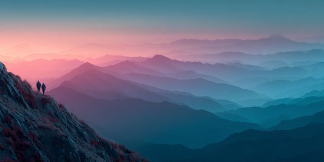 As the first blush of dawn touches the sky, a serene tapestry of muted earth tones unfurls across an endless sequence of rolling mountains. Nestled in this breathtaking landscape are two hikers, small yet significant, standing on a rugged peak. They are silhouetted against a backdrop of fading night stars and the emerging morning glow, painting an inspiring tableau of human endeavor and natural beauty. Far in the distance, the iconic skyline of San Francisco merges with the celestial hues, creating a picture of urban dreams met by the vast, untamed wilderness. This minimalist mountain landscape captures the harmony of geometric forms with the fluidity of nature, crafting an abstract vision that resonates with peace and contemplation. The juxtaposition of the bustling city skyline and the tranquil, expansive mountains emphasizes a deep, resonating contrast between humanity and the natural world, inviting viewers to reflect on their own places within these spaces.