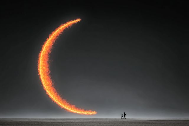 As twilight descends upon a surreal landscape, the moon transforms into a radiant silhouette of fire, bending willingly into a crescent to envelop a solitary sun. This striking image captures a fleeting moment of celestial embrace reminiscent of a scene one might witness at the vibrant Burning Man festival. Swathed in shadows and light, two figures, small yet profound, stand beneath the flaming arc, their presence a testament to the power of connection in an expansive universe. The artwork pulses with a sense of unity and warmth, enveloping the viewer in a spectacle of sublime beauty and mystery. The fiery tones of the moon contrast sharply with the muted, monochrome palette of the surrounding space, drawing eyes immediately to the brilliant arch that dominates the composition. This visual metaphor, crafted with bold simplicity, evokes a deep emotional response, reflecting themes of love, togetherness, and the universal dance between day and night. As viewers, we are invited not only to observe but to feel the cosmic energy and artistic fervor that such an image conveys—an invitation to ponder our own place within the vast tapestries of existence.