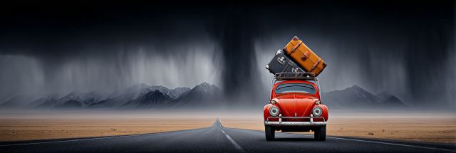 Amidst a world of towering mountains and expansive horizons, a vibrant red vintage car embarks on an adventure along a lonely stretch of highway. Laden with bright orange suitcases, reminiscent of a bygone era of travel, the scene encapsulates a spirit of wanderlust and the timeless allure of the open road. The gloomy skies overhead, streaked with the drama of impending rain, create a striking contrast with the glossy red paint of the car, emphasizing the boldness of its journey into the unpredictable wilderness. The meticulously maintained vehicle, with its emblematic curves and gleaming chrome accents, stands as a beacon of human ingenuity and nostalgia against the raw, untouched landscape that stretches into infinity. This image speaks to the brave-hearted, those who seek the thrill of discovery and the joy of escaping the mundane. Let this visual odyssey ignite your imagination, as you contemplate the freedoms and mysteries lying just beyond the horizon, where the road meets the wild.