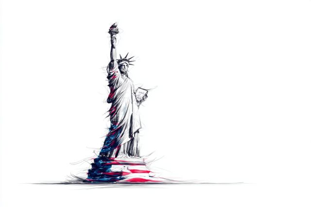 Elegant and poised, this minimalist continuous line artwork captivates the essence of iconic American symbols. With each stroke, the Statue of Liberty, an eagle, and the American flag are seamlessly connected in a solitary, fluid movement that symbolizes unity and freedom. The artwork features a striking yet simple black line drawing that gracefully flows across a pristine white background. Subtle accents in red, white, and blue breathe life into the composition, enhancing the patriotic theme with a touch of sophistication. This Nordic minimal style not only celebrates the ideals of liberty and democracy but also evokes a deep sense of national pride. The stark contrast between the vivid hues and the minimalist design invites viewers to a contemplative journey through the symbols that have shaped American identity. Whether observed up close or from afar, this piece remains a poignant reminder of the values that bind a nation together, rendered through art that is both modern in approach and profound in meaning.