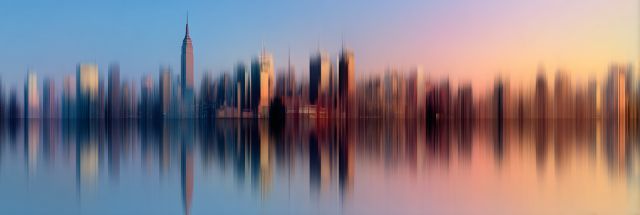 Blurred Harmony: Pastel Dawn Over New York City Skyline