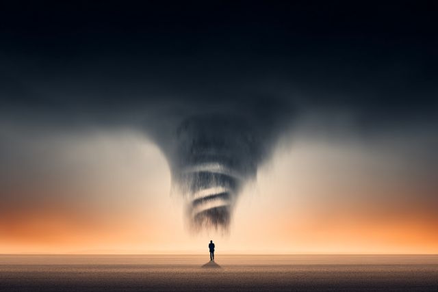 Amidst an expansive horizon where the ethereal meets the terrestrial, a striking visual narrative unfolds—a single figure stands poised as a mighty tornado descends in an otherworldly ballet of wind and spirit. The scene captures the ephemeral moment before nature's untamed power and human vulnerability collide, enveloping the viewer in a profound dialogue between chaos and serenity. Drenched in a spectrum spanning the fiery oranges of a sun-drenched dusk to the ominous grays of tempestuous clouds, this image stirs the soul and evokes a deep sense of awe. The masterful use of contrast between the storm's dark, swirling fury and the tranquil, luminous horizon emphasizes the transient beauty of natural forces. The figure, small yet resolute, offers a compelling juxtaposition against the overwhelming majesty of the funnel cloud, a powerful symbol of human resilience in the face of nature's vastness. This artwork not only captures a moment of climatic drama but also invites introspection about one's own standing in the vast tableau of life. Every detail —from the textured whirls of the tornado to the reflective stillness of the ground— is rendered with an intensity that pulls the observer into a narrative that is both intimate and grandiose.