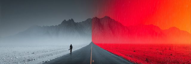 Journey into the Surreal: A Dichotomous Road Under Red Skies