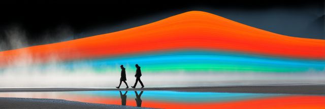 Amidst the enchanting landscapes of Spotted Lake in British Columbia, two figures emerge, silhouetted against a blazing horizon that painterly blends fiery oranges with cool, tranquil blues. This spectacular canvas captures a moment of human connection within an almost surreal, dreamlike natural wonder known for its mystical mineral formations. As each jogger strides forward, their reflections ripple crisply on the water’s surface, mirroring their movement and the vibrant skies above. This striking visual juxtaposition not only highlights the unique biochemical phenomena of the lake but also echoes the vibrant spirit of adventure that defines the region. The scene evokes a sense of boundless freedom and the transient beauty of human interaction with nature, brought to life through a spectrum that suggests the otherworldly vistas of a burning man festival. This artwork seduces the viewer into a narrative that transcends the ordinary—a celebration of color, movement, and the ephemeral intersections of man with the majestic landscapes of Canada.