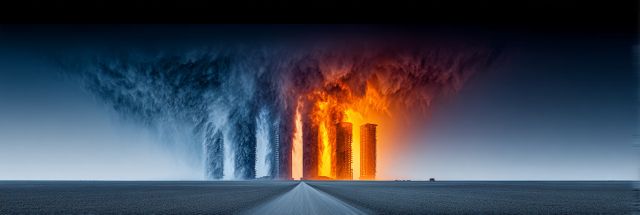 Amidst the calm desolation of a vast, featureless desert, a scene that stirs the soul unfolds under the dramatic expanse of an ever-changing sky. At first glance, the contrast is stark: serene, cool blues of a sweeping sky meet the searing oranges and yellows of gigantic structures ablaze, evoking a surreal and apocalyptic tableau reminiscent of a Burning Man installation. This canvas artfully stitches together the tranquility of an empty road that draws the observer’s eyes toward the chaos, forging a connection between the viewer and the visceral intensity of the scene.