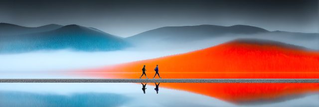 As the day folds into twilight, a mesmerizing scene unfolds at Spotted Lake, British Columbia—a sight that transcends the ordinary. Beneath a sky muted by the whispers of dusk, two joggers forge their path alongside a strikingly vibrant streak of orange, which paints the landscape with a surreal burst of color. The lake mirrors this fiery ribbon, doubling its impact and creating a perfect symmetry that slices through the cooler tones of the surrounding hills. This tableau is more than a mere photograph; it is a vivid dance of colors and contrasts where nature meets the fantastical. The reflection on the water not only doubles the visual feast but also invites onlookers into a meditative state, as the symmetry between earth and sky blurs the boundaries of reality. This artwork encapsulates a fleeting moment where human endeavor vibrates in harmony with nature's sublime beauty. The joggers, diminutive yet distinct, navigate this dreamlike expanse, their figures a testament to the scale and grandeur of their surroundings. This piece not only captures the essence of Spotted Lake but also conveys the universal quest for tranquility and the relentless pursuit of discovery.