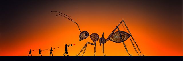 As the skies bleed into hues of fiery orange and soft amber, a remarkable scene unfolds on the horizon that challenges the norms of conventional reality and breathes life into a fantastical narrative. Here, against the endless canvas of the twilight sky, humans and a mammoth-sized ant engage in a seemingly cooperative journey, echoing elements of cooperation and surrealism reminiscent of a fantastical odyssey. The oversized ant, striking in its detail and artistic engineering, parades across the barren landscape, led by a string of tiny human figures who guide this colossal creature with ropes, manifesting an aura of both control and harmony. This extraordinary tableau interweaves the raw beauty of the natural landscape with the intricacy of human imagination, creating a compelling contradiction between the scale of human endeavor and the vastness of nature. The portrayal not only captivates the viewer but also stirs a contemplation of the delicate balance between humans and nature, art and reality, power and submission. Each element of this composition—from the detailed, skeletal framework of the ant to the resilient stride of the human figures—tells a story of enduring spirit and creative resilience, making this artwork a powerful statement on the infinite possibilities of artistic expression.