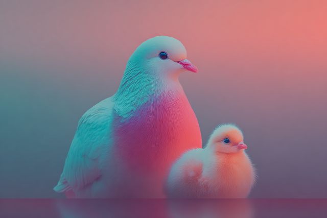 In an alluring display of vibrant hues, a peacock and its two chicks emerge, bathed in a mesmerizing gradient of pinks and blues. The mother bird’s feathers unfold with a soft, pastel radiance that contrasts sharply against the deepening shades of the backdrop, creating a visual symphony of color and warmth. The tender scene encapsulates a moment of quietude and familial bonding, as the vigilant eyes of the mother cast a protective gaze over her fluffy offspring. The brilliant use of lighting accentuates the silky textures of the subjects, making the feather details appear almost tactile. This composition not only celebrates the beauty of these majestic birds but also invokes a sense of peacefulness and tranquility, inviting the viewer to pause and appreciate the simpler moments of natural wonder. The artwork is centered on a serene narrative, where the concept of family and care is universal and beautifully rendered through the lens of fantasy and creativity.