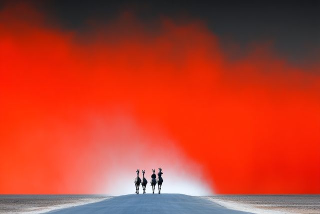 In an evocative blend of reality and dream, three silhouettes stride forward on an endless road, bathed under a sky that burns with a fierce, otherworldly red. The stark contrast between the stark black figures and the vivid, almost liquid flame of the sky captivates the viewer, drawing them into a narrative of endless possibilities. This image, a stunning creation reminiscent of the boundless creativity observed at the Burning Man Festival, uses bold colors and simple forms to evoke a sense of adventure and surrealism. The road, perfectly centered, stretches into infinity, promising a journey that transcends the ordinary. As the eye travels along this vanishing point, the mind wanders, constructing tales of escape, pursuit, and exploration. The fiery sky not only illuminates the scene but also wraps everything in a veil of mystery and anticipation. This art piece challenges the traditional interpretations of landscape and opens a dialogue with the viewer about the paths we choose and the destinations we dream of. It encourages contemplation on where we are going and reflects the profound journeys of the soul that often lie hidden beneath the mundane layers of daily existence.