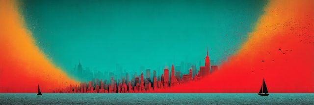 As dusk settles over the horizon, a breathtaking panorama unfolds, depicting New York City in a surreal ensemble of color and light. Set against the backdrop of a serene sea, the iconic skyline springs to life, adorned with a mesmerizing gradient of turquoise that bleeds into fiery hues. This haunting image is not just a representation but a vibrant reimagining of the urban landscape. The spire of the Empire State Building pierces the sky, standing as a beacon amidst the myriad of skyscrapers, each shaded in darker silhouettes against the incandescent sky. Below, the calm waters carry a lone sailboat, blissfully cutting through the reflection of this incendiary skyline, adding a poignant sense of motion and solitude. This artwork captures not only the physical essence of New York City but also evokes a sense of wonder and infinite possibility that the city embodies. The use of vivid colors and shadowed city structures strategically blurs the lines between fantasy and reality, inviting viewers to rethink the boundaries of urban art. The fine implementation of color not only highlights the city’s famed architecture but also adds a layer of mystical aura that is both captivating and invigorating.