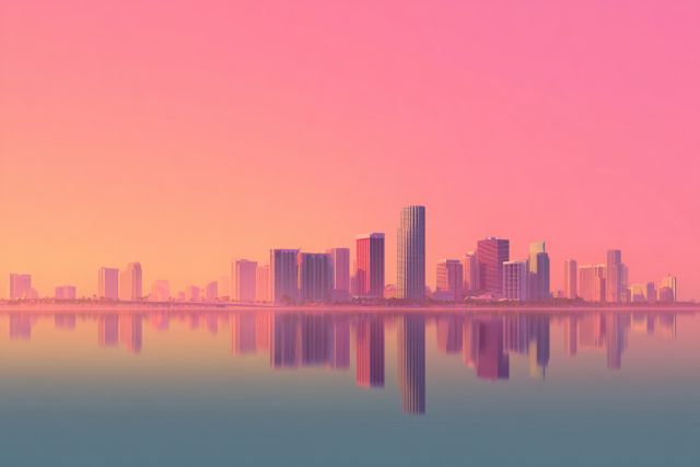 Drenched in the soft hues of dawn, the Miami skyline emerges as an ethereal backdrop against the tranquil waters that mirror its grandeur. This artistic rendering transforms the bustling cityscape into a serene tableau, where the calm pink sky meets its reflection, creating a flawless symmetry. The skyscrapers, bathed in a gradient of warm peaches to cool lavenders, bridge the gap between reality and abstraction. Each building subtly fades into the next through masterfully executed shadow effects, cultivating a sense of infinite continuity across the canvas. This piece captures not only the architectural beauty of Miami but also evokes a contemplative mood, prompting viewers to pause and reflect on the city’s dynamic spirit amidst the quiet of daybreak. As the city sleeps, its iconic structures stand monumental, telling stories of their daytime bustle in muted tones and soft transitions. This artwork invites you to lose yourself in its minimalist beauty, a soothing retreat from the vibrancy of everyday life.