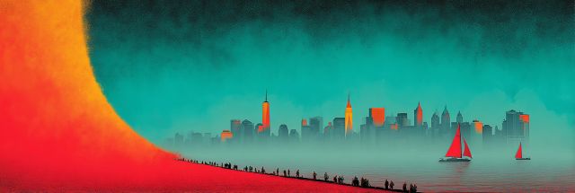 As the fiery hues of sunset merge with the tranquil blues of a dusk sky, an enchanting depiction of New York’s skyline unfolds, kissed by both nature’s serenity and the fervor of human festivity. Stylized with an inspiration drawn from the effervescent spirit of the Burning Man festival, this art piece weaves a visual story that bridges the gap between the metropolitan pulse of New York and a surreal, outlandish dreamscape. Silhouetted against a blazing orange swath that sweeps over the canvas, the iconic buildings stand tall, glistening subtly in the diminishing light. Below, tiny silhouettes of people, perhaps revelers of an unseen urban festivity, add a layer of mystery and life, hinting at stories untold and celebrations deep into the night. The vibrancy of the red-orange gradient encapsulates the heat of the desert sun, synonymous with the Burning Man culture, while the crisp turquoise horizon promises the coolness of the city's night. This art piece is not just a mere blend of color and form but an invitation to delve into the juxtaposition of chaos and calm, celebration and solitude.