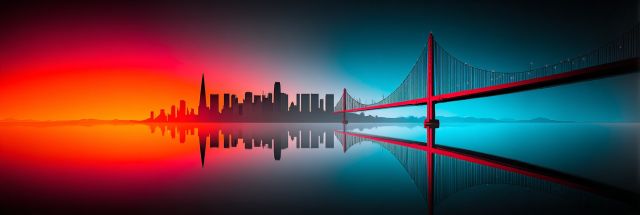 In an arresting meld of fantasy and reality, the San Francisco skyline is reimagined through a filter of Burning Man's iconic ethos, creating an artwork that stirs the soul and electrifies the senses. As dawn breaks, the city awakens along the calm waters that mirror its grandeur with a mesmerizing symmetry. The iconic silhouette of the Golden Gate Bridge, depicted in a striking shade of red, arches gracefully across the horizon, linking not just two shores but also bridging the ordinary with the fantastic. The sky, painted in gradients of deep blues and fiery oranges, sets a backdrop that pulsates with the possibility and energy synonymous with both San Francisco and the desert festival of lights and expression. This canvas is not just a view but an invitation: to dive into a world where urban landscapes meet whimsical artistic expression. Each building, each reflective ripple tells a story of innovation, creativity, and boundless possibilities, inviting the viewer to not just see a city but to experience a festival of dreams across the water.