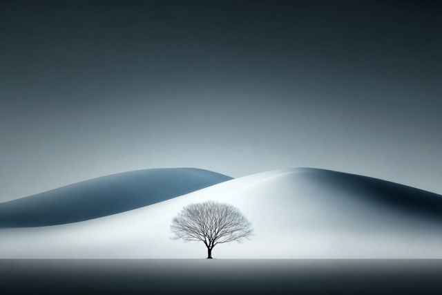Enveloped by the gentle embrace of undulating snowy hills, a solitary tree stands as a testament to quiet resilience and graceful simplicity. This minimalist landscape, captured on canvas, weaves a visual poetry that speaks to the soul's yearning for peace and the awe-inspiring beauty of nature's understatement. The stark contrast of the tree’s bare branches against the soft, silvery glow of the hills evokes a sense of isolation and introspection, inviting the viewer to reflect on the sparse yet profound statements of existence. As light plays over the curves of the landscape, it casts an ethereal glow that seems almost otherworldly, enhancing the scene's dreamlike quality. This artwork not only captures the essence of serene solitude but also embodies the universal longing for clarity and a return to the basics of natural beauty. It stirs an emotional resonance as one contemplates the enduring strength of a single tree amidst the expansive quietude. The artistic rendering encourages a meditative gaze, making it a perfect piece to infuse any space with a sense of calm and contemplative silence.
