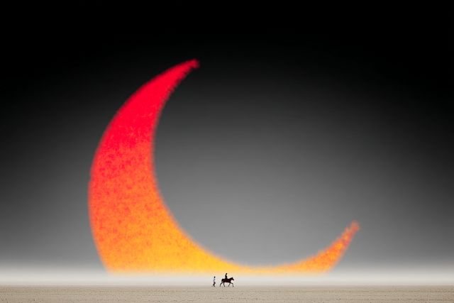 Imagine stepping into a scene where the impossible becomes tangible, where an immense, flaming crescent moon bends its fiery arc low over an expansive, muted landscape. The air thrums with energy, charged by the vivid glow of this celestial spectacle—a sight so overwhelmingly vivid it sears itself into memory. Amidst this surreal backdrop of grey, two silhouetted figures on horseback traverse the endless flat terrain directly below the lunar curve, their small forms dwarfed yet emboldened by the glowing arc that lights their path. Their journey beneath the burning crescent is a silent testament to the human spirit’s quest for wonder and the thrill of exploring uncharted realms. The intensity of the crimson and orange hues contrasts sharply with the underplayed grey of the earth, crafting a visual allegory of heat against the cool desolation of the ground below. This artwork engages the senses, inviting the viewer to feel the warmth of the moon’s blaze and hear the whisper of the horses' hooves across the barren ground. It speaks of solitude and companionship, of adventure and introspection, rendering an ordinary scene into something profoundly mythical.
