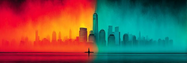 Envision the electrifying spirit of New York City blending seamlessly with the vivid charm of the Burning Man Festival, captured in this exquisite canvas. Majestic skyscrapers pierce the horizon, with the iconic Freedom Tower soaring above an ethereal cityscape. The artwork pulsed with a dual-hued vibrancy, a spectacular gradient of fiery reds and serene blues paint the sky, invoking a dance of daylight and dusk. Wave-like silhouettes hint at the calm waters, possibly the Hudson, reflecting the city's illuminated soul. This stirring image not only showcases a panorama of architectural grandeur but also whispers tales of bustling streets below, where dreams are weaved and pursued relentlessly. As the colors transition beautifully, they symbolize the city's relentless energy and the untamed essence of one of the world's most dynamic art festivals. Each hue is intricately layered, crafting a visual symphony that celebrates the fusion of urban life with radical artistic expression. A solitary figure in the foreground gazes out across the water, a poignant reminder of the individual stories among the city's vast tapestry. This artwork speaks to those who see magic in city lights and feel the rhythm of the urban heartbeat.
