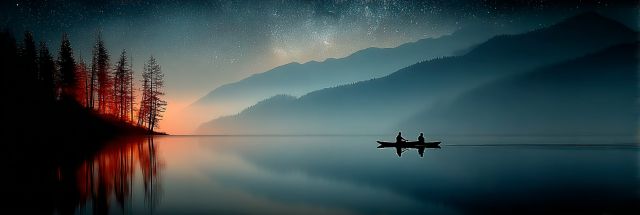 Under the celestial tapestry of a sparkling night sky, two kayakers glide gently across the glassy surface of a mountain lake. The Milky Way, a shimmering river of stars, casts a soft luminescence, illuminating the tranquil waters and silhouetting the distant rolling hills. To the east, the sunset still whispers its last goodbyes in a warm, fading glow, painting the horizon in hues of deep orange and crimson. Surrounding the lake, ancient pines stand as silent sentinels, their rugged outlines etched against the night sky. This panoramic spectacle, set in a secluded wilderness, invokes a sense of profound peace and awe at the universe's vast beauty. The image is a masterful capture of nature's grandeur, inviting viewers to pause and reflect on the serene moments of life, the kind that gently ebbs the hustle of everyday existence. It embodies a dreamlike quality, where every element converges into a perfect symphony of light and shadow, earth and sky. The scene is not just seen but felt, enveloping the onlooker in its mystic serenity and the timeless dance of light across the cosmos.