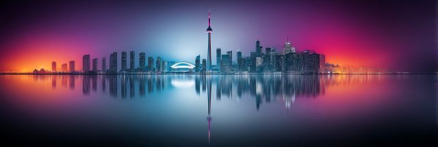 As dusk settles over the city, Toronto’s famed skyline emerges like a luminous sea creature, bathed in a surreal jellyfish glow. This quintessential canvas captures the skyline in a riot of colors, from deep violets to fiery pinks, casting its reflection across the still waters. The iconic CN Tower stands sentinel, piercing the skyline, while the modern curves of the nearby buildings dance in symphony, reflecting a festival-like vibrancy inspired by the creative spirit of Burning Man. This panoramic view is not just a visual treat but a journey into the heart of Toronto’s dynamic atmosphere. Bathed in ethereal light, the cityscape stretches into a horizon that blurs the line between water and sky, reality and fantasy. This image, rich in detail and color, transports viewers to a moment of tranquility and wonder, highlighting architectural beauty and the serene power of symmetry. It’s as if the city has dressed itself in its finest, ready for a nightly celebration under the watchful eye of the cosmos.