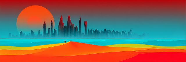 Washed in the vibrant hues of a descending sun, this striking artwork blurs the line between nature's serenity and urban excitement. Cascading dunes, reminiscent of a fantastical desert, roll gently into the foreground, their bright oranges and reds melting into soothing blues, reflecting perhaps the cool onset of night. In stark contrast, the silhouette of a distant city skyline cuts a sharp serrated edge against an oversized sun, glowing like a colossal ember poised to set the horizon afire. Dominating the scene is the artistic rendition of what could be a fusion of famed skylines, their towers spear-like under the fiery sky. The artwork, a tableau of harmony and contrast, invites the viewer to explore the peaceful yet potent dynamism that city life promises. It evokes a sense of wonder, nudging one to ponder the delicate balance between mankind’s creations and the natural world. As a landscape awash with dreamy colors, it also provokes thoughts of worlds unseen, places born from the amalgamation of reality and fantasy where every moment holds the weight of countless stories.