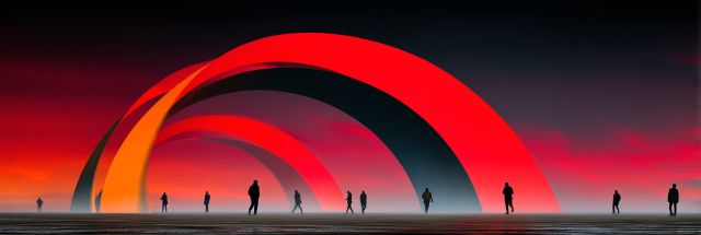 Suspended between the realms of the surreal and the terrestrial, Resonant Silhouettes takes viewers on an evocative journey. The panorama unfolds under a vast sky, painted with the fiery hues of dusk, where colossal arches soar, bending reality with their vibrant, magnetic reds. Echoing the ethos of Burning Man, the artwork captures the transformational essence of human gatherings, encapsulating both individuality and community. Each silhouette, a singular entity against the enormity of nature and creation, together forms a narrative of fleeting moments caught in the permanence of art. The clean, reflective earthly plane mirrors not just the gravity-defying arches but also the nuanced stories of those who walk beneath them. This composition becomes a sanctuary, not only for those depicted within, but also for the observer, offering a canvas to project their feelings and experiences. As the spectrum of color transitions to night, the viewer is left to ponder themes of existence, connection, and the infinite dance between light and darkness, individuality and collectivity.