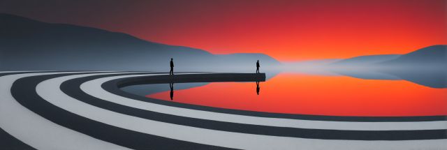 Bathed in a palette of fiery oranges and cool blues, this artwork evokes a sense of awe as it merges two iconic elements into one: the natural beauty of Spotted Lake, British Columbia, and the cultural vibrancy of the Burning Man festival. The scene enfolds with clarity and mystery under the caress of an otherworldly twilight. Silhouetted figures meander along serpentine paths that loop infinitely across the canvas, symbolizing both a physical and spiritual journey. This depiction is not just a visual treat but a narrative of contrasts and synchronicities. Vivid and stirring, the artwork pulls the viewer into a dual narrative of nature's quiet, enduring patterns and humanity’s ephemeral, exuberant expressions. Here, the traditional landscape transforms, challenging perceptions and inviting the onlooker to explore a world where reality intertwines with fantastical elements, each curve and color urging a deeper introspection into our relationship with the world's hidden wonders and cultural creations.