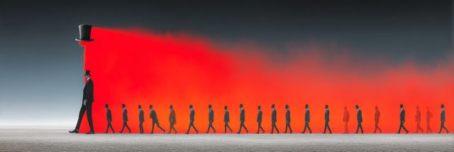 Amidst a mesmerizing and stark scenic backdrop, a line of silhouetted figures march uniformly under the omniscient gaze of a man donned in formal attire, trailing a billowing red mist. This striking image captures a surreal interpretation, reminiscent of a futuristic solemn parade or a poignant symbolism of monotonous conformity in modern society. The contrasting calm of the desolate landscape against the vivid red outpour illustrates a world of dualities, evoking a range of emotions from awe to introspection. The intense red that cuts through the scene might remind one of the dusty hues of a Burning Man sunset, transformed into an artful statement. The lone figure, differentiated by his elevated hat and distinct posture, leads this faceless group with a both foreboding and enlightening presence, suggesting themes of leadership, isolation, and the human condition in the digital or dystopian age. As one contemplates the composition, the stark minimalism partnered with dramatic coloration pulls the observer into a narrative that is as open-ended as it is captivating.