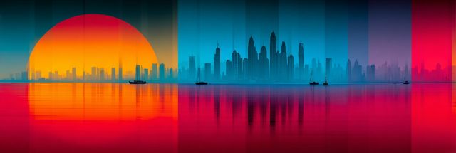 As the day yields to night, a magnificent sun dips below the horizon in a resplendent display of fiery orange and deep crimson. Reflected in the still waters below, this celestial orb sets the sky ablaze, painting a canvas that stretches above a silhouette of towering skyscrapers. This urban skyline comes alive under the influence of sunset’s last kiss, where the buildings morph into dark monoliths outlined against the gradually darkening sky. Each skyscraper, distinct yet collectively forming an impressive metropolis, whispers stories of the bustling life within its walls. The serene water in the foreground, dotted with the graceful figures of small boats, adds a tranquil contrast to the electric vibrancy of the sky. The image captures not just a simple sunset but the interaction of elements — water, sky, city, and light — in a harmony that resonates with the soul of the viewer. This artwork of sunset over the city serves as a gateway to introspection, where the explosive colors of the sky ignite the passions and the calm water soothes the spirit. It invites viewers to pause and immerse in the scene — a fleeting moment where nature and humanity converge in a spectacular tableau.