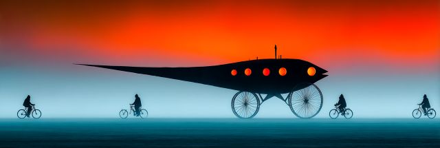 Under the embrace of a mesmerizing sunset that bleeds shades of fiery orange into tranquil azure, a scene unfolds that is both surreal and captivating. Four cyclists, silhouetted against the vast canvas of the horizon, embark on an enigmatic journey across a barren landscape. The mystery deepens with the presence of a fantastical airship, its design reminiscent of retro-futuristic inventions, floating effortlessly above the ground. This airship, adorned with glowing circular windows, seems to survey the world below, its presence a silent guardian over the travelers. The blend of everyday cycling with the extraordinary airship conjures a narrative steeped in adventure and imagination. As the day fades, the boundary between the possible and the fantastical blurs, inviting viewers to leave behind the mundane and delve into a realm where the wonders of human creativity and nature collide spectacularly.