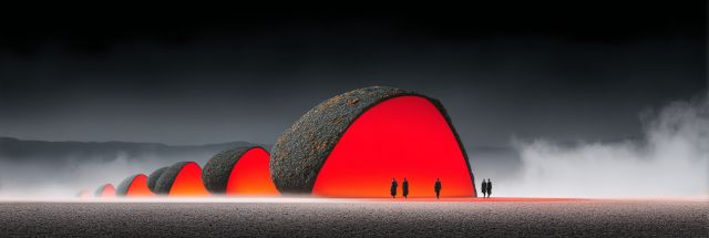 Amidst an expanse of barren terrain unfolds a spectacular vision—a series of gigantic Lithops, mimicking Living Rocks, staged dramatically against an incandescent horizon. These colossal, arch-like structures emerge from the earth, their rugged textures reminiscent of ancient, weathered stones. Each segment glistens under the haunting glow of a radiant, crimson backdrop that illuminates the scene, evoking the vibrant spirit of the Burning Man Festival. In the foreground, silhouettes of lone figures wander near these monumental creations, dwarfed by their majestic presence yet connected through the shared experience of awe.