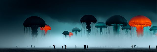 As dusk cloaks the horizon, a surreal scene unfolds across the serene expanse, where ethereal jellyfish-like structures dominate the skyline. Emanating an otherworldly glow, these colossal figures float gracefully above the ground, casting a spellbinding silhouette against the chilling backdrop of a stormy sky. Each jellyfish, with tendrils flowing like wisps of smoke, paints a picture of an enigmatic underwater realm miraculously brought to the surface. Observers, appearing minuscule in comparison, are scattered below, some in contemplation, others in mid-conversation, all equally mesmerized by the spectacle overhead. The varying shades of blue and ghostly white, punctuated by a daring splash of red on one of the creatures, add a dramatic tone to the composition, suggesting a narrative that is as mysterious as it is captivating. This vivid portrayal not only captures a moment of shared human marvel but also taps into the depths of our collective imagination, urging us to consider realms beyond the ordinary.