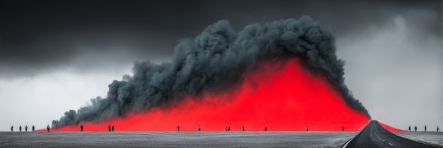 Envision a vivid odyssey where a lone road slices through an apocalyptic panorama, a surreal vision straight from an otherworldly narrative. In the artwork, an endless pavement stretches into the horizon, cutting through a haunting landscape where ethereal figures meander, their purposes as enigmatic as the scene itself. Above, a colossal plume of dense, dark smoke unfurls across the sky, tinged with an eerie, blood-red glow that seeps from beneath, staining the heavens and earth with an ominous scarlet. This stark dichotomy of colors—a chilling grey scale against the furious red—evokes a primal reaction, hinting at chaos yet mesmerizing in its stark beauty. The image teeters on the edge of reality, inviting viewers to contemplate narratives of escape, environmental upheaval, or even metaphysical boundaries. It plays with the senses, making the heart race with its intense hues and the mind wander amidst its mysterious figures. This art piece not only serves as a visual spectacle but also stirs a deep, contemplative dialogue about where we stand in the face of overwhelming forces, both natural and man-made.