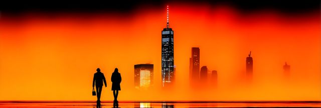 Enveloped in a radiant, fiery orange glow, this striking artwork imbues the New York skyline with a sense of drama and mystique reminiscent of the Burning Man festival's vibrant milieu. Dominating the composition is the One World Trade Center, proudly piercing the sky as the tallest edifice in the Western Hemisphere. The effect of the fiery backdrop sets the city alight in a warm, surreal glow, lending an otherworldly aura that contrasts sharply with the urban starkness of the skyscrapers. Two silhouetted figures stand in the foreground, their identities obscured and universal, inviting viewers to place themselves within the scene, reflecting on their own experiences or dreams of the famed metropolis. As dusk seems to settle, or a dawn appears to break, the boundary between day and night blurs, creating a timeless moment, frozen within the canvas. The intensity of the orange hues bathes every corner of the cityscape, creating stark, compelling contrasts and projecting the powerful resilience and the burning ambitions that New York stands as a testament to. Art lovers and observers alike are drawn into a sensory journey through light, color, and silhouette, where the familiar contours of an iconic cityscape are reimagined through a lens of fantastical color and emotive imagery.