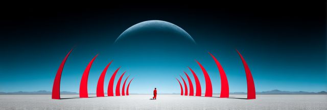 Imagine stepping into a vast expanse where the ordinary meets the extraordinary. In the heart of a boundless desert, a sequence of striking red arcs stretches into the horizon, creating a pathway that leads to a surreal oversized moon looming in the bright blue sky. This stunning piece of art, inspired by the spirit of the Burning Man festival, invites viewers into a world where creativity and cosmos collide. A solitary figure clad in red walks towards the lunar mirage, symbolizing solitude and the search for personal meaning amidst the grandeur of the universe. The stark contrast between the fiery reds and the serene blues evokes a feeling of wonder and introspection. This composition is not just a visual feast; it's a journey of the mind and soul, daring to explore what lies beyond the edge of imagination. As the arcs guide your eyes and thoughts to infinity, this artwork becomes a gateway to the extraordinary, offering a moment of connectivity with the majestic and mysterious elements of nature.