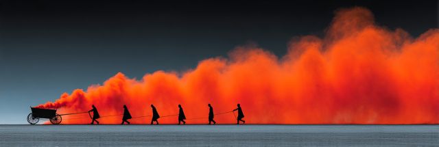 In an arresting display of visual poetry, a line of figures marches tirelessly across a boundless landscape, towing an enigmatic carriage. This magnificent artwork, inspired by the energy and spirit of the Burning Man festival, captivates with its stark contrast and surreal ambiance. The fiery horizon blazes with an intense orange and red palette, suggesting a celestial inferno that both illuminates and consumes the horizon. Meanwhile, the cool, deep blue of the sky offers a serene counterpoint, forming a mesmeric backdrop that highlights the drama unfolding beneath.