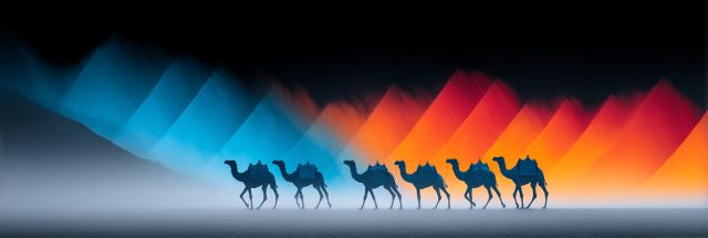 Imagine stepping into a vibrant mirage where silhouettes of graceful camels stride under a cascade of iridescent hues. This evocative piece of art captures a surreal procession of camels, their forms outlined against a backdrop that transitions through a kaleidoscope of bold, fiery colors to soothing shades of blue and indigo. Each camel, consistent in its noble poise, adds a grounded earthiness to the surreal, dream-like quality of the scene. The contrast between the stark, foggy foreground and the geometric clarity of the parabolic light arches creates a spellbinding visual rhetoric of motion and stillness. This artwork brilliantly synthesizes elements of nature with a stylized, almost futuristic play on light and shadow. The radiant beams forming sharp angles suggest a dynamic interplay of natural and artificial, while the minimalist setting keeps the focus on the camels’ serene journey. The viewer is invited to contemplate themes of travel, mystery, and the natural versus the constructed. As the colors shift, so does the mood, encouraging interpretations that range from the hopeful rise of daybreak to the introspective depth of dusk.