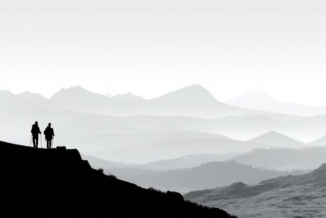 Silhouettes and Shadows: Hikers Gazing Across Misty Mountain Ridges