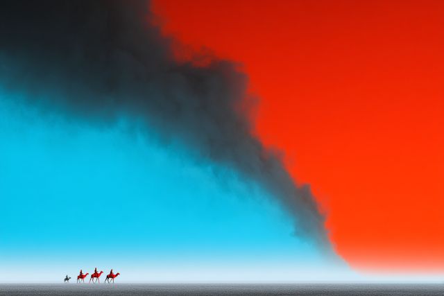 A stunning visual narrative unfolds under an extraordinary dual-toned sky, where a stark contrast paints a tale of two halves. The sky, a magnificent canvas, splits into vibrant red and tranquil blue, each tone bleeding into the next with the intensity of a burning flame meeting the calmness of an ocean. Below this celestial spectacle, a horizon stretches infinitely, grounded by a narrow strip of earth where silhouettes of four horse riders traverse the boundary line that separates the fiery fervor from peaceful azure. As the riders move in unison, their journey seems both ethereal and anchored, a symbolic march through contrasting emotions and elements. The artwork captures a moment frozen in time, a visual metaphor for balance and transition, where the vibrancy of life’s challenges meets the quietude of solace. Each hue and shape tells a story — the fiery red evokes passion and energy, while the soothing blue imparts calmness and reflection. This striking duality invites the viewer to contemplate the coexistence of opposing forces within nature and within themselves.