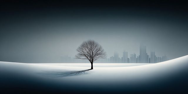 As if frozen in time, a lone tree stands guard over a snowy expanse, with the distant New York City skyline etched against the winter sky like a modern mirage. This serene panorama captures the stark beauty of a single, leafless tree—its branches sprawling outward in delicate filigree against the canvas of soft, muted blues and whites. The tree's dark, defined silhouette serves as a poignant counterpoint to the soft undulations of the snow-covered ground, emphasizing the quiet resilience of nature amidst urban encroachment. The image, rich in its simplicity and powerful in its isolation, evokes a sense of calm introspection. The skyline in the far distance, though blurred and almost melting into the horizon, hints at the bustling life beyond the silent snowfield, providing a subtle reminder of the relentless pace of city life contrasted with the tree's stoic stillness. This artwork invites the viewer to pause and reflect on the solitude and beauty of nature juxtaposed against human creation—a compelling narrative of coexistence and contrast.