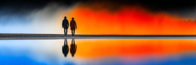Amid the mystique of British Columbia's fabled landscape, a couple saunters along the reflective shores of Spotted Lake, their silhouettes casting serene shadows on the water's mirror-like surface. As twilight cloaks the sky, the horizon blazes with an intense, fiery gradient, reminiscent of the eccentric spirit of the Burning Man festival. This canvas encapsulates a moment where nature and culture intertwine dramatically, creating a stirring tableau of color and human connection. The couple, dwarfed by the grandeur of their surroundings, appear as intrepid explorers trekking through an otherworldly realm. The lake’s famed therapeutic waters, rich with mineral deposits, shimmer under the fiery sky, reflecting a spectrum of burning oranges and sultry reds. This enchanting scene invites viewers to ponder the profound bond between human beings and the sublime forces of nature. Enriched by the raw, elemental beauty of the landscape, this artwork is not just a visual delight but an evocation of emotion and thought, urging contemplation on our place within the natural world.