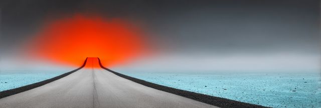 Embark on a mesmerizing journey along an expansive road that draws the eye toward a horizon aflame with a stunning sunset. As one gazes at this striking scene, the road stands as a bold, unwavering line cutting through a vast landscape of soft grey hues and distant shadows. The ground on either side, speckled with hints of sapphire, accentuates the surreal, dream-like quality of the scene. This artwork masterfully contrasts the fiery orb of the sun, which burns brightly in a symphony of red and orange, against the cool, subdued tones of the surrounding landscape. The atmosphere is charged with a sense of mystery and boundless possibility, inviting reflections on one’s own path and future. The image is a synthesis of motion and stillness, where the static elements emphasize the eternal flow of time and the road symbolizes endless opportunities. Evoking sensations of solitude and introspection, this piece captures the essence of a solitary journey toward the unknown, illuminated by the hopeful glow of an impending nightfall.