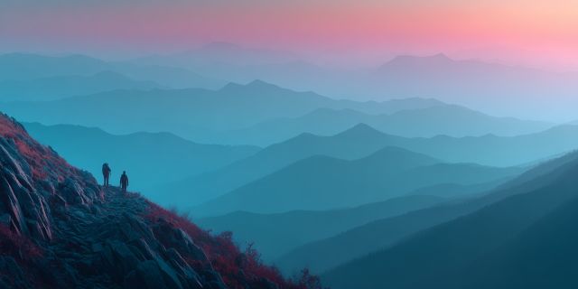 Twilight Trek: Hikers Exploring the Ethereal Mountain Vista