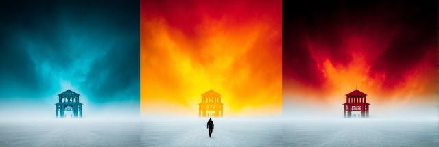 Journey into the ethereal realms of color and fog, where each section of this stunning triptych canvas merges the palpable essence of emotion with the architectural. Across three panels, hues transit from a tranquil, profound blue to a fierce, engulfing red, and finally to a serene, enigmatic indigo, each segment marked by a distinct, solitary architectural structure that echoes the enigmatic allure of frosty landscapes. The central panel commands attention with its fiery aura, a solitary figure approaching a building that seems to emanate an almost sacred incandescence, suggesting a pilgrimage through realms of visceral emotion. This piece masterfully imbues the stark geometries of minimalism with the raw intensity of color blocking, crafting a narrative that speaks to both the celestial journey and the individual's encounter with self and surroundings. Towards the edges, the blue and indigo skies perform a soothing ballet of hues, providing a visual respite, and yet imbuing the scene with a hauntingly beautiful melancholy. This artwork not only captures the imagination but also invites the viewer to traverse their internal landscape, as if walking in a dream suffused with colors that spell out deep, unspoken feelings.