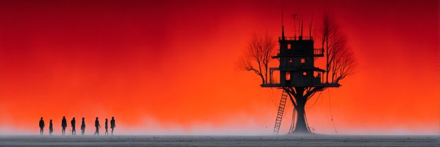 In a palette of fiery red and profound black, an arresting image unfolds where the horizon blurs the line between reality and fantasy. As the sky bleeds into intense shades of crimson, a mysterious structure—a whimsical composite of a tree and a fantastical multi-tiered house—stands silhouetted against the engulfing sunset. This striking visual narrative is further enriched by the figures progressing towards this enigmatic abode. Each silhouette, a small but significant part of the composition, adds to the stark yet vibrant atmosphere, suggesting a journey towards an unknown destination. The stark landscape, devoid of other features, focuses the viewers' attention on the interaction between the human figures and the surreal architectural element. This depiction, reflective of scenes one might conjure while dreaming, invites the observer to ponder on themes of isolation, exploration, and the quest for belonging in a world straddling the thin line between dreams and waking moments. Each element from the barren ground to the vibrant sky speaks volumes about the artist's skill in weaving color, light, and shadow into a tapestry that both captivates and mystifies.