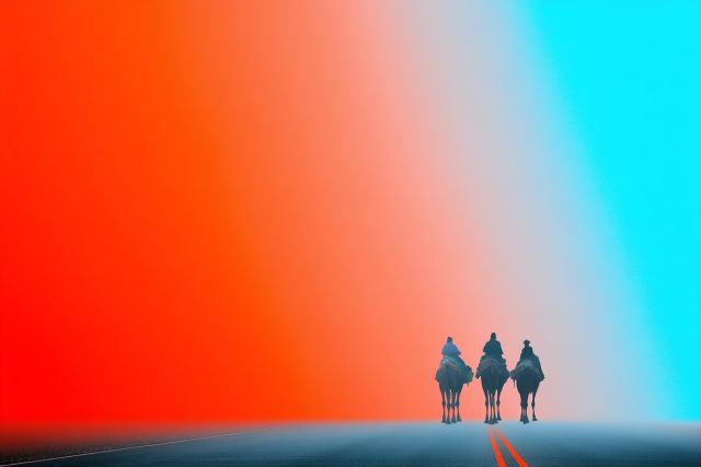 As the world stretches out into a myriad of chromatic possibilities, a vibrant road bisected by a bold orange stripe guides three silhouetted camels and their unseen riders toward the far reaches of imagination. This artistic creation transports the viewer to a seemingly otherworldly scene, combining the natural grace of these majestic desert animals with a backdrop that pulses with electric blues and fiery oranges. The stark contrast of the camels against the surreal colors evokes a sense of both tranquility and adventure. Echoing the spirit of wanderlust and the unknown, this piece beautifully encapsulates the essence of a journey not only through spaces but also through the boundaries of artistic expression. As the camels tread softly along this infinite road, one cannot help but wonder about the worlds that lie just beyond that vivid horizon, encouraging a sense of curiosity and the thrill of exploration.
