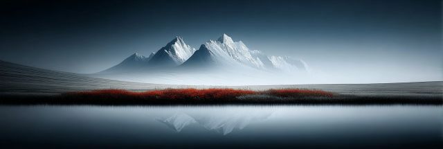 As dawn breaks, the gentle hues of morning light kiss the towering, snow-capped mountains, creating a breathtaking contrast against the serene blue sky. Below these majestic peaks, an endless meadow, drenched in the remnants of nighttime, sprawls vividly. The eye is irresistibly drawn to the vibrant red mosses painting the waterlogged earth, a stark enclave of autumn amidst a subdued palette of fading greens. This panoramic vista is mirrored perfectly in the still waters, offering a double spectacle of raw, untouched natural beauty. The ethereal quality of the light, combined with the crisp mountain air, infuses the scene with a sense of peace and solitude. This photograph, with its meticulous composition and stunning depth, transports the observer into a realm where the elegant dance of seasons unfolds with graceful transitions. Each element, from the finely textured peaks to the richly colored flora, is captured with a clarity that only high-resolution photography can provide. The shallow depth of field focuses our attention, making the distant mountains appear almost within reach, yet ethereally isolated from the world’s tumult. This is not just an image; it is an invitation to bask in the quiet majesty of nature’s artistry, a reminder of the serene moments that lie in wait when we pause to look.