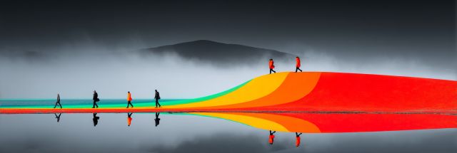 Amidst the ethereal mists and silent majesty of Spotted Lake in British Columbia emerges a vision so vivid it might just belong in a dream. A sinuous path, illuminated in radiant swathes of red, orange, green, and yellow, ripples across the glassy surface of the lake. This canvas captures silhouetted figures traversing this vibrant walkway, their reflections mirroring their movements in perfect harmony with the surreal landscape. Evoking the lively essence of the Burning Man festival, the artwork invites onlookers into a realm where reality blends with vibrant imagination. This fantastical creation not only decorates a silent lake but also whispers secrets of joy, unity, and the transcendence of ordinary moments into extraordinary memories. As the distant hills loom in soft focus, wrapped in a fog that seems to promise endless mysteries, the artwork becomes a narrative not just of a place, but of moments, feelings, and a dance of colors that beckons the soul to wander into its depths.