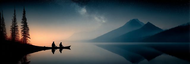 As dusk settles across the landscape, a breathtaking scene unfolds under the celestial theatre of the night sky. Perched peacefully on a glassy mountain lake, two kayakers sit in tranquil silence, engrossed in the mesmerizing beauty of the heavens. The lake, a perfect mirror, reflects the myriad stars twinkling above, intertwined with the ethereal Milky Way’s dusty trail. The surrounding pine trees stand as silent sentinels, casting slender shadows that stretch into the water, creating a harmonious blend of sky and earth. In the background, majestic mountains rise sharply, their outlines softened by the moon’s gentle luminescence. This setting isn’t merely a backdrop—it is a spellbinding escape that captures the interplay of light and shadow, bringing a profound sense of peace to anyone who gazes upon it. Each element of this composition, from the serene kayakers to the silhouetted pines, contributes to an overwhelming sense of solitude and contemplation. This image not only showcases the splendor of nature but also captures the essence of human interaction with the wild, encouraging a quiet reflection on the vastness of our universe.