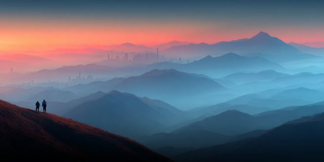 As the first light of dawn crests the horizon, it casts a warm, vibrant glow that subtly transitions from fiery oranges to tranquil blues, painting a picture of calm and inspiration over the distant San Francisco skyline. In the foreground, two hikers stand poised on a mountain ridge, silhouetted against the awakening sky, embodying the spirit of adventure and discovery. They overlook a succession of majestic, softly undulating mountains that fade into the mist, creating layers of depth and mystery. Each peak, bathed in gradient shades, contributes to a serene tapestry that invites the viewer to pause and reflect on the grandeur of nature juxtaposed with human endeavor. The minimalist yet evocative style enhances the inherent quietude and vastness of the scene, making it a poignant reminder of the subtle interplay between urban life and the wild, natural world.