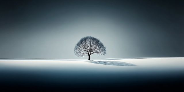 In the grasp of a visual simplicity, a single tree stands resilient against an expansive monochrome backdrop, striking a poignant contrast between solitude and the boundless sky. The tree's delicate branches spread outward in a display of natural elegance, capturing the essence of serenity and the harsh beauty of isolation. The stark white foreground blends seamlessly with subtle gradients of blue, evoking a sense of infinity and peace. This artwork, embodying minimalism at its finest, speaks to the soul's yearning for tranquility and the contemplative silence one finds amidst nature's simplicity. Each branch is etched with a precision that celebrates the intricate details of life, standing as a metaphor for resilience and growth in the face of vast, open emptiness. As the eye travels towards the horizon, the interaction of light and shadow plays a mesmerizing dance, creating a dynamic yet soothing visual experience that invites reflection and introspection. This piece is not just an artwork; it is a poetic exploration of space, solitude, and the subtle interplay between nature and the human emotion it evokes.